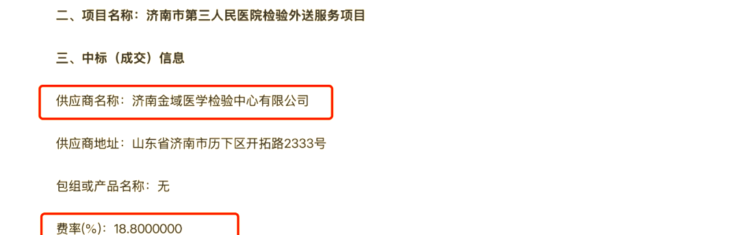 检验项目的结算扣率持续下滑,成为ICL低利润的核心原因。在疫情的影响下,众多第三方实验室为求生存,不得不将医院外送项目的扣率压至极低水平。据公开资料显示,部分医院的试剂项目结算扣率甚至降至1字头。以济南市第三人民医院为例,其检验外送服务项目的成交公告中,费率仅为8%。在如此低扣率的情况下,第三方检验所仍需承担庞大的实验和物流团队,确保样本的及时检测与报告出具,这无疑加剧了他们的运营负担。